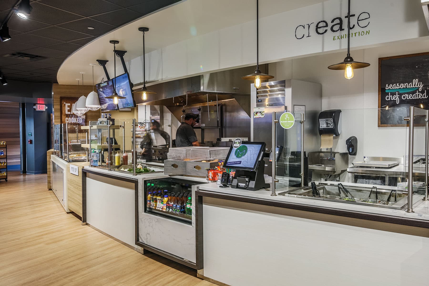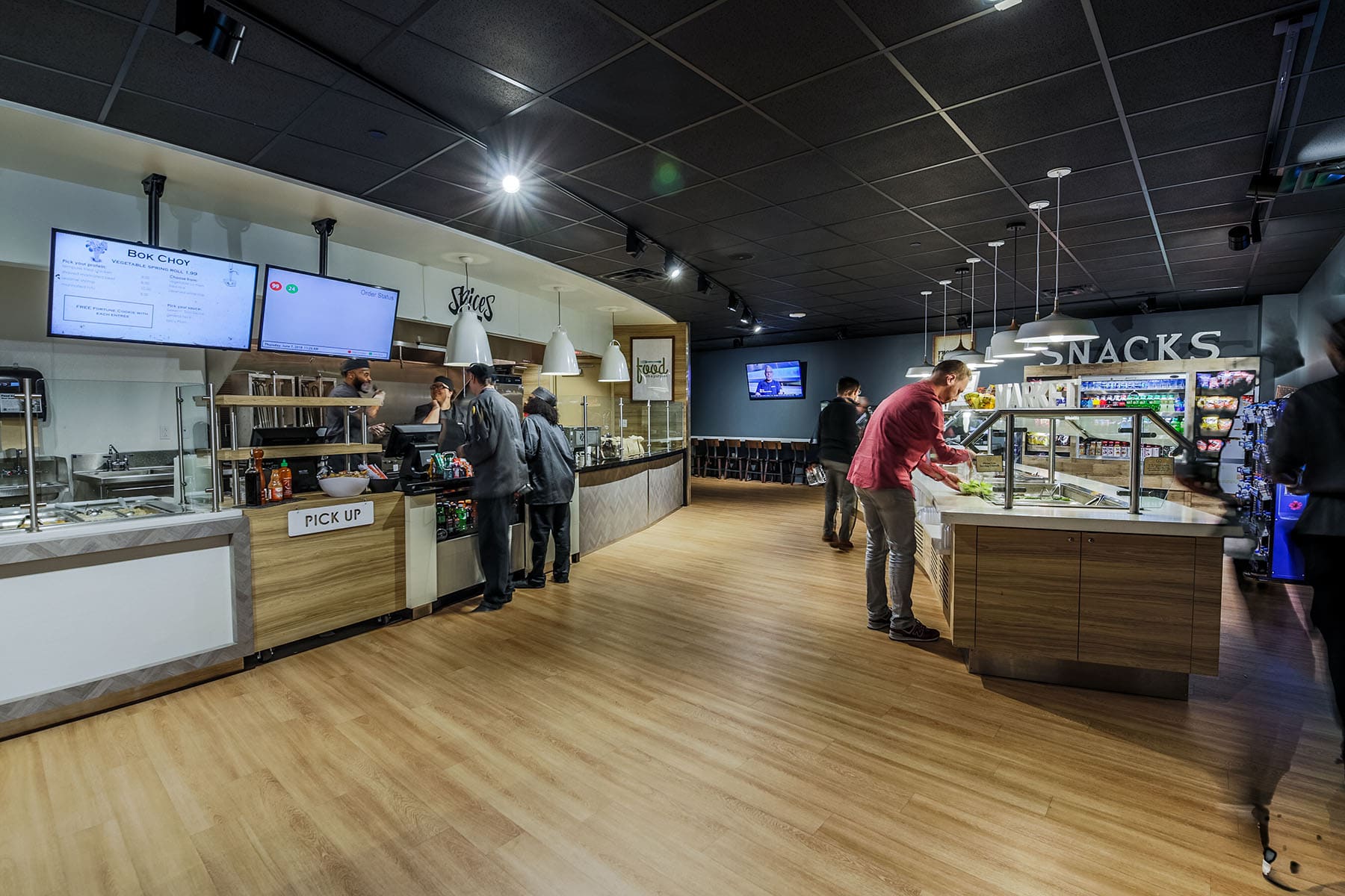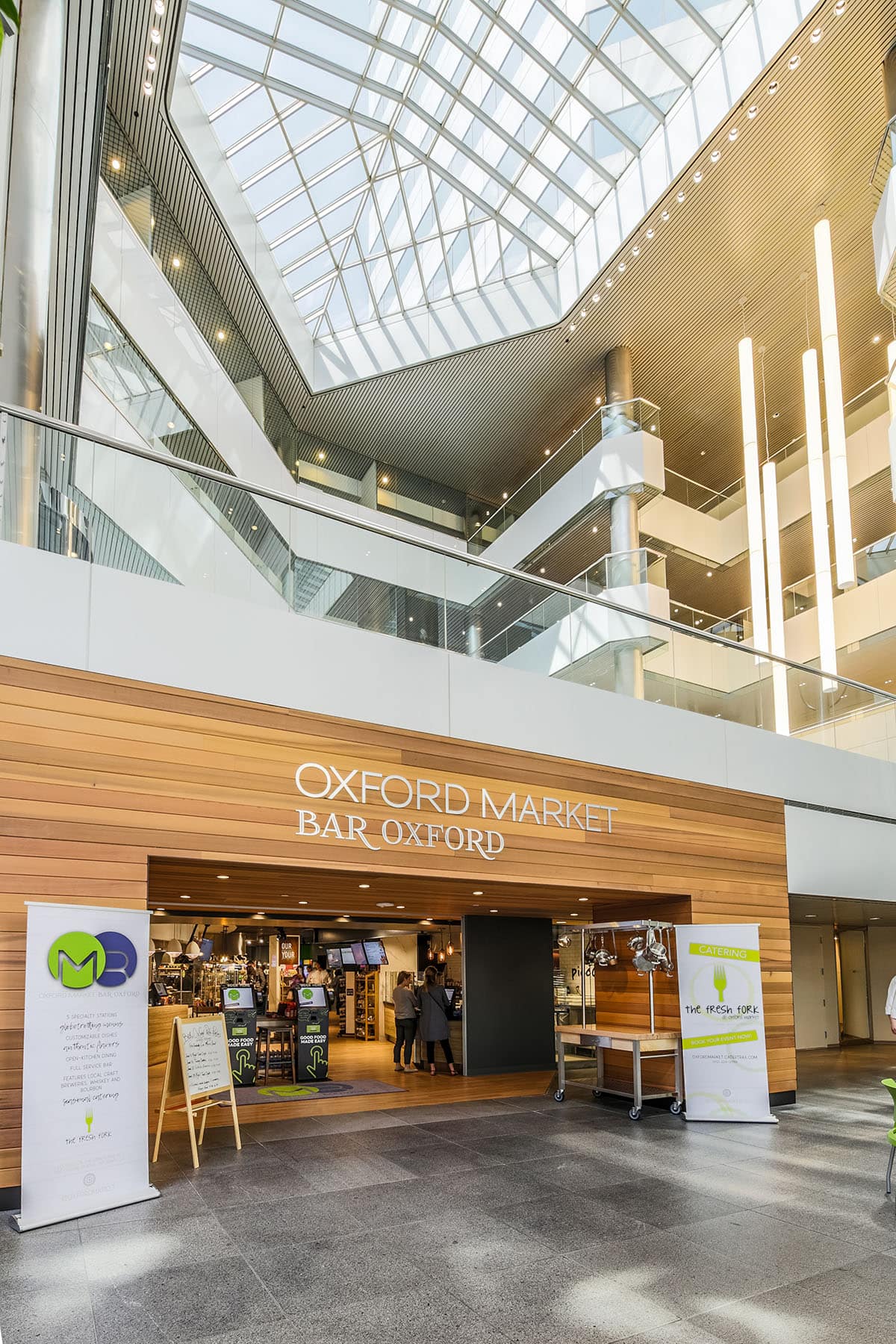 The upgraded space now offers five food stations, fresh pasta, a salad bar and the option to order online. The kiosks in Oxford Market allow patrons to order online ahead of time then pick up their meal at a station for a quick transaction.