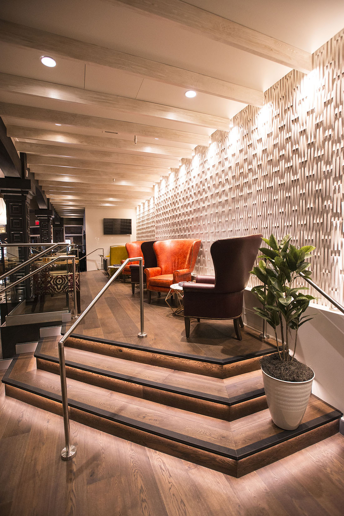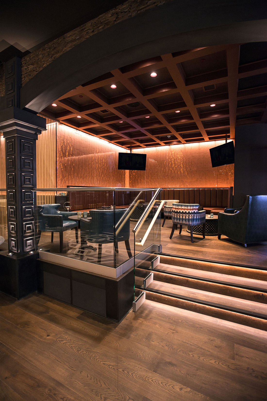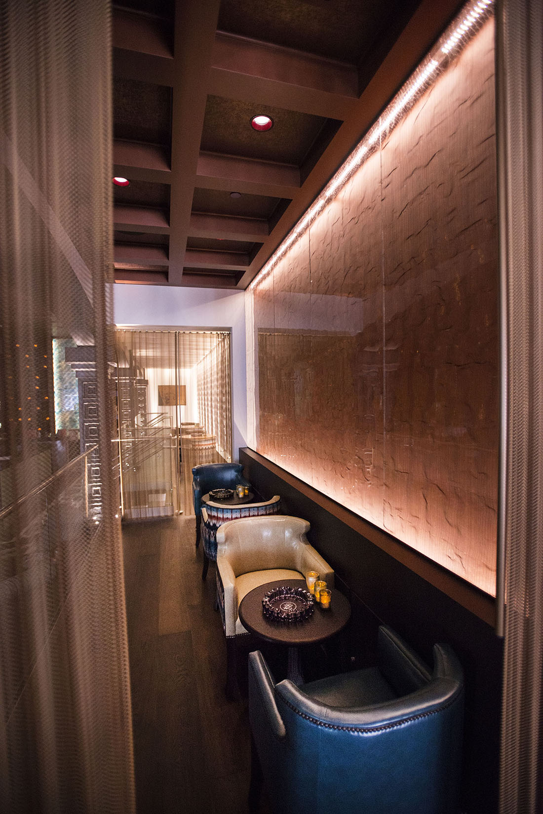 The décor is eclectic, with Asian, Mediterranean and Caribbean influences. Exotic wood flooring is offset by a black-white-gray tile pattern that gives off an optical illusion in the space. These tiles are diamond-shaped parallelograms. Each one is the same size, but the alternating pattern makes it appear that the tiles further away from your eye are smaller. A challenge with this element of the design was that the tile was delivered on mesh mats, by color, which was not the original intention. The flooring subcontractor, Phillips, had to cute each individual tile for each mat and then they were placed in the pattern on the floor. Once the floor was laid out all the way around the bar, the geometric tiles fit perfectly into place. Many of the finish materials in this space were sourced directly by Swatchroom, who led the efforts of conceptual design and brand development, or Rocky Patel from around the world.