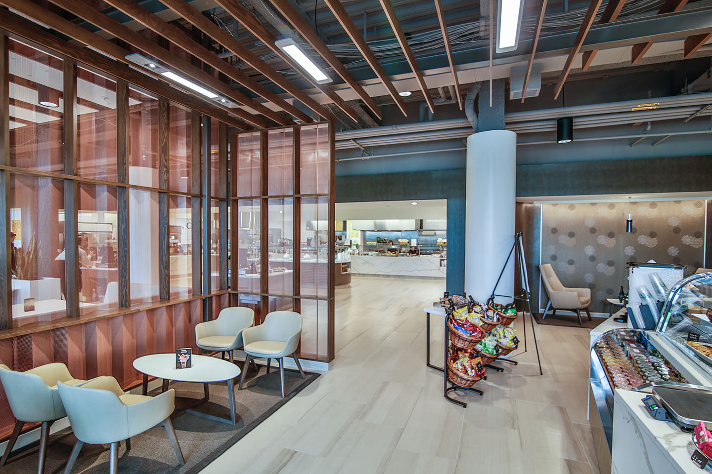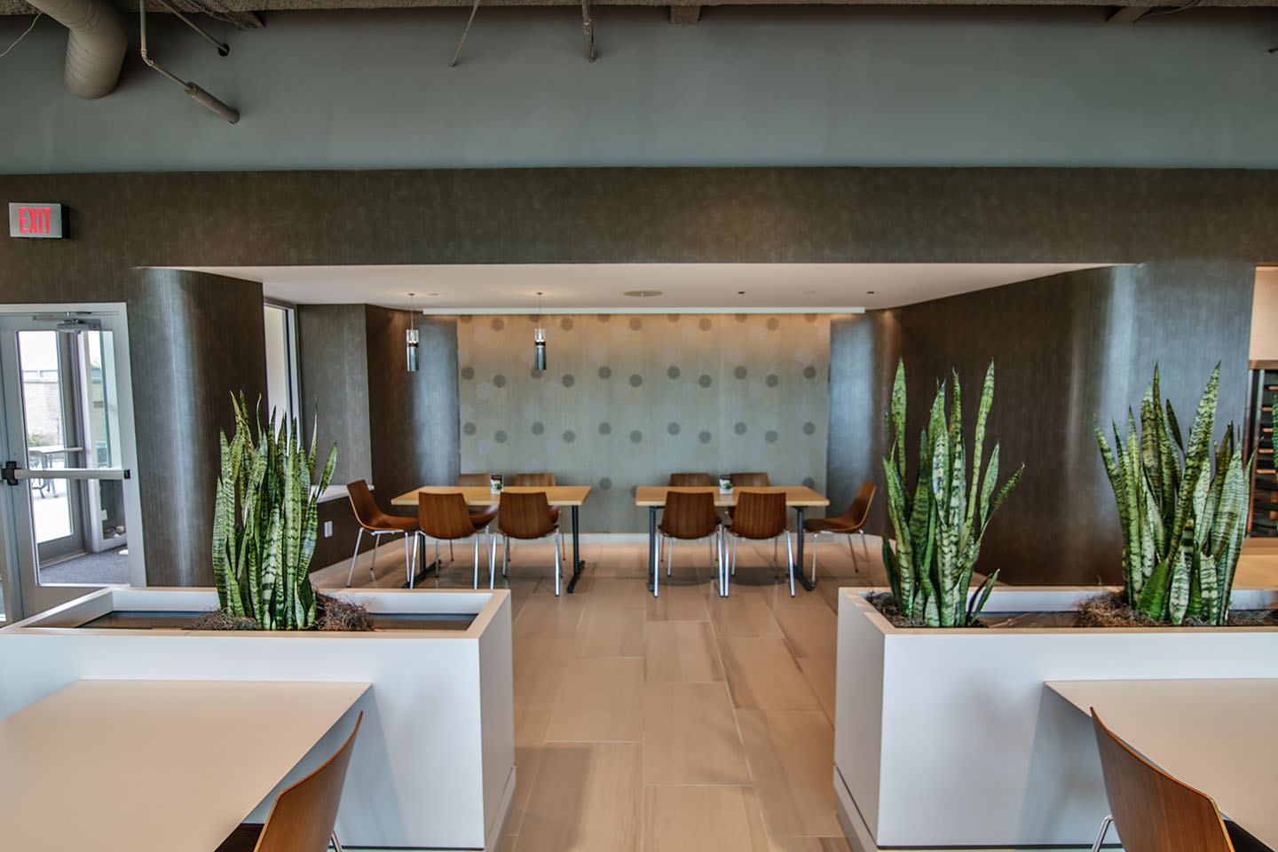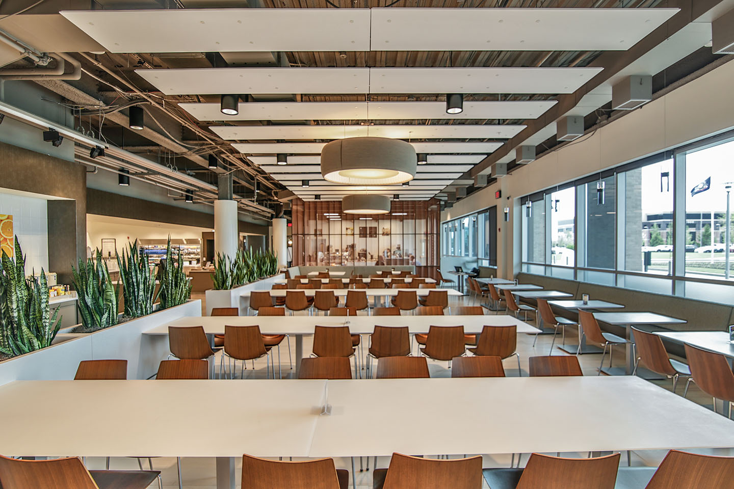 Crown Castle chose to stick with a more industrial and airy feeling, utilizing large pendant light fixtures, down lights and acoustical plan ceiling tiles above the seating area. Another feature added to this space was a Starbucks-type barista which serves coffee and snack items and is at the front of the cafeteria, allowing staff to purchase items even when the cafeteria is closed between service times.