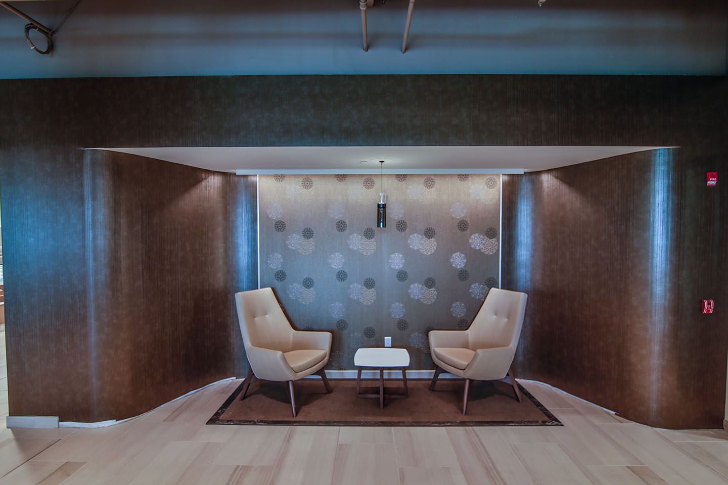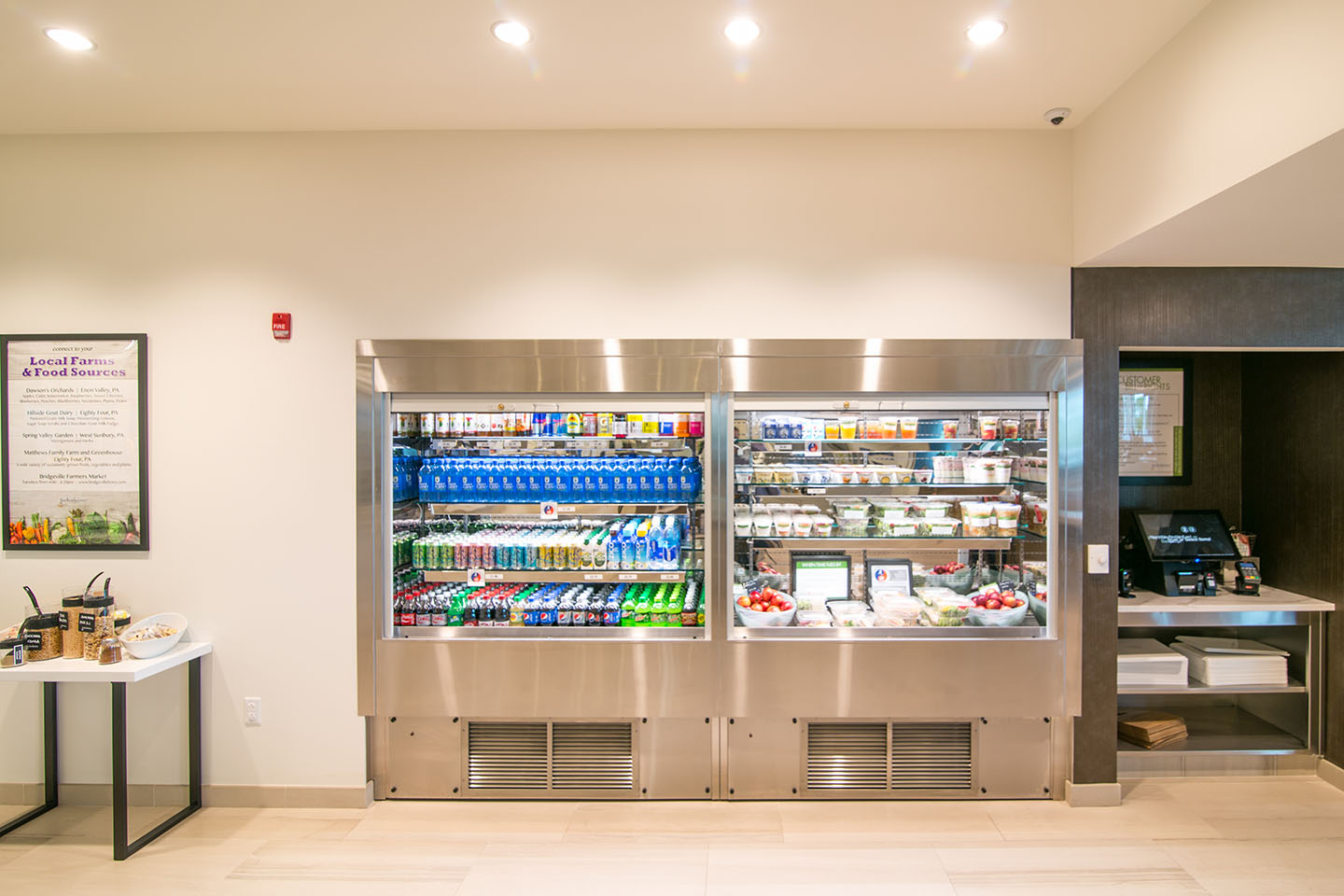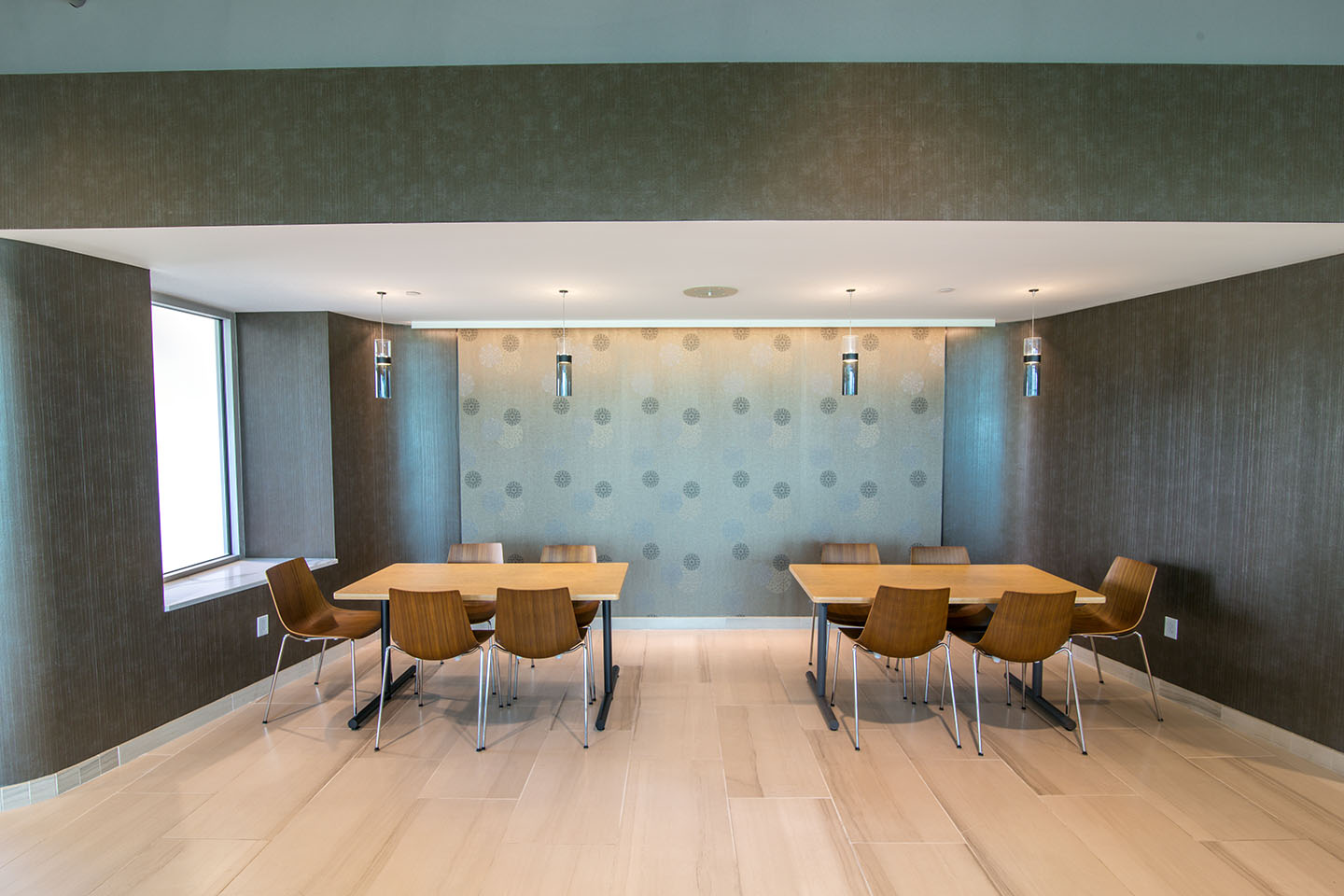 The goal was to build a cafeteria with the character typical of a museum café, which would include bright, open spaces with clean lines and neutral finishes. Crown Castle’s mission for this area was to build a space that would draw their staff in for informal team meetings or scheduled appointments, while also providing an open area where staff could work, and escape the typical “cubical” work stations. The main kitchen area includes multiple coolers, refrigeration units, pizza ovens, carving stations, back of house prep areas for breakfast, lunch and large meetings on Crown’s campus. The dining area seats 146, utilizing a combination of tables, chairs and banquette seating. The construction and open floor plan, along with the furniture selection, per Crown Castle’s request, creates a sense of community and allows a variety of seating choices.