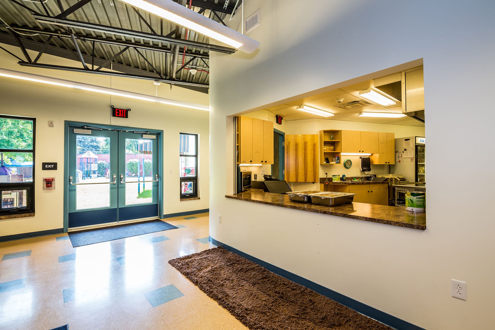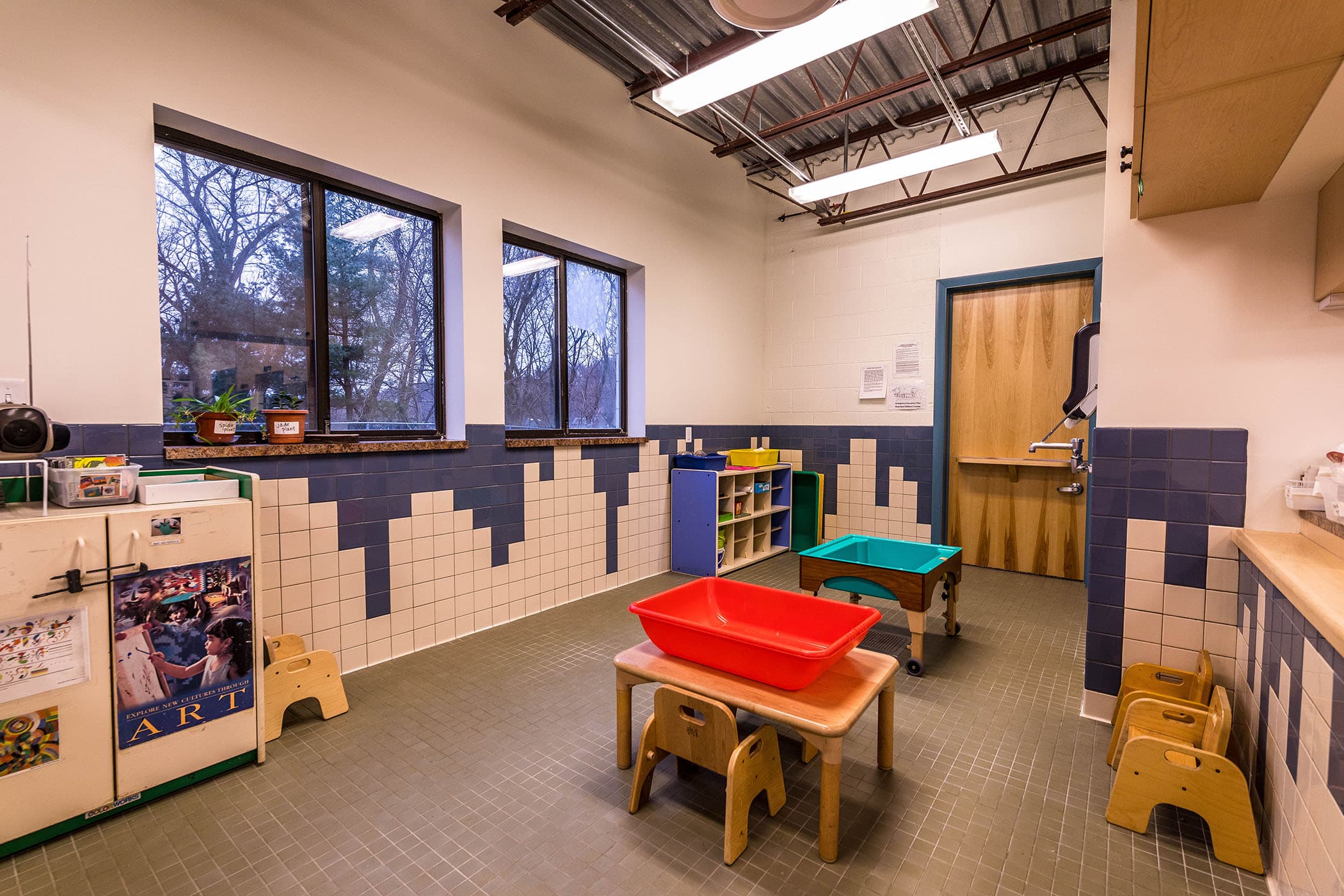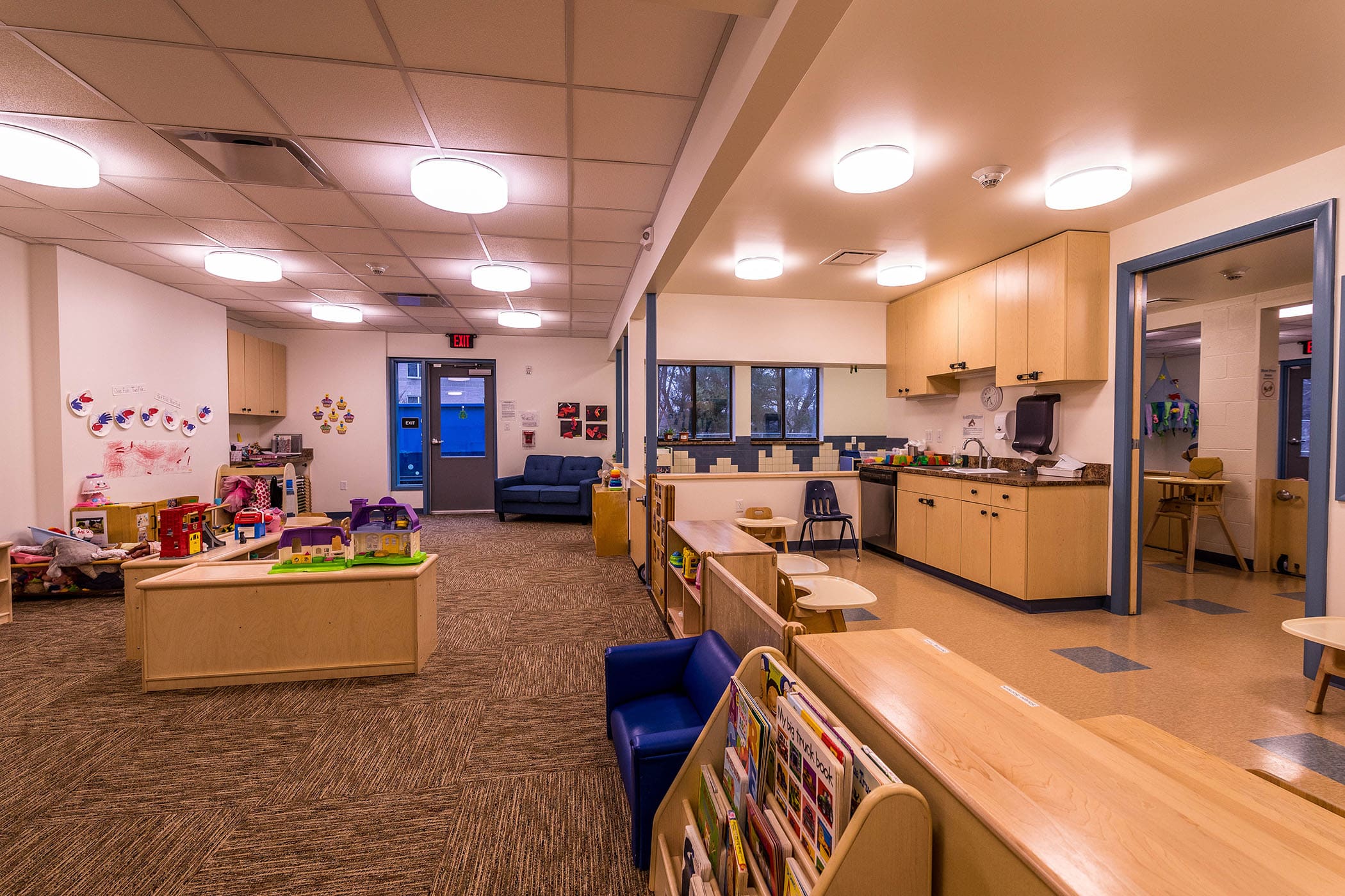 The RCC expansion and renovation included upgrades to the infant and toddler rooms, including water play and sensory areas; a new kitchen to accommodate lunch times for all students at the school; a new addition to the school along the back which incorporated a new gathering/play space with garage doors that open to the outdoor area, giving students and staff indoor/outdoor space when the weather is nice; additional classrooms and renovation to the front administrative offices and conference room.