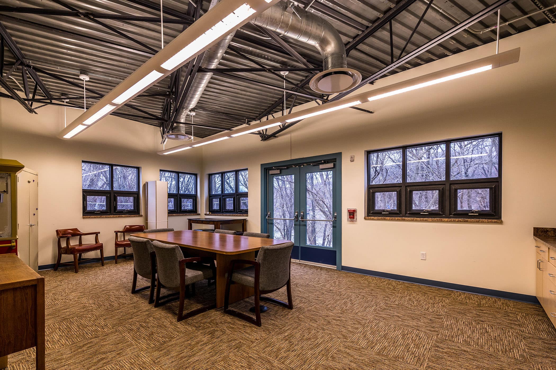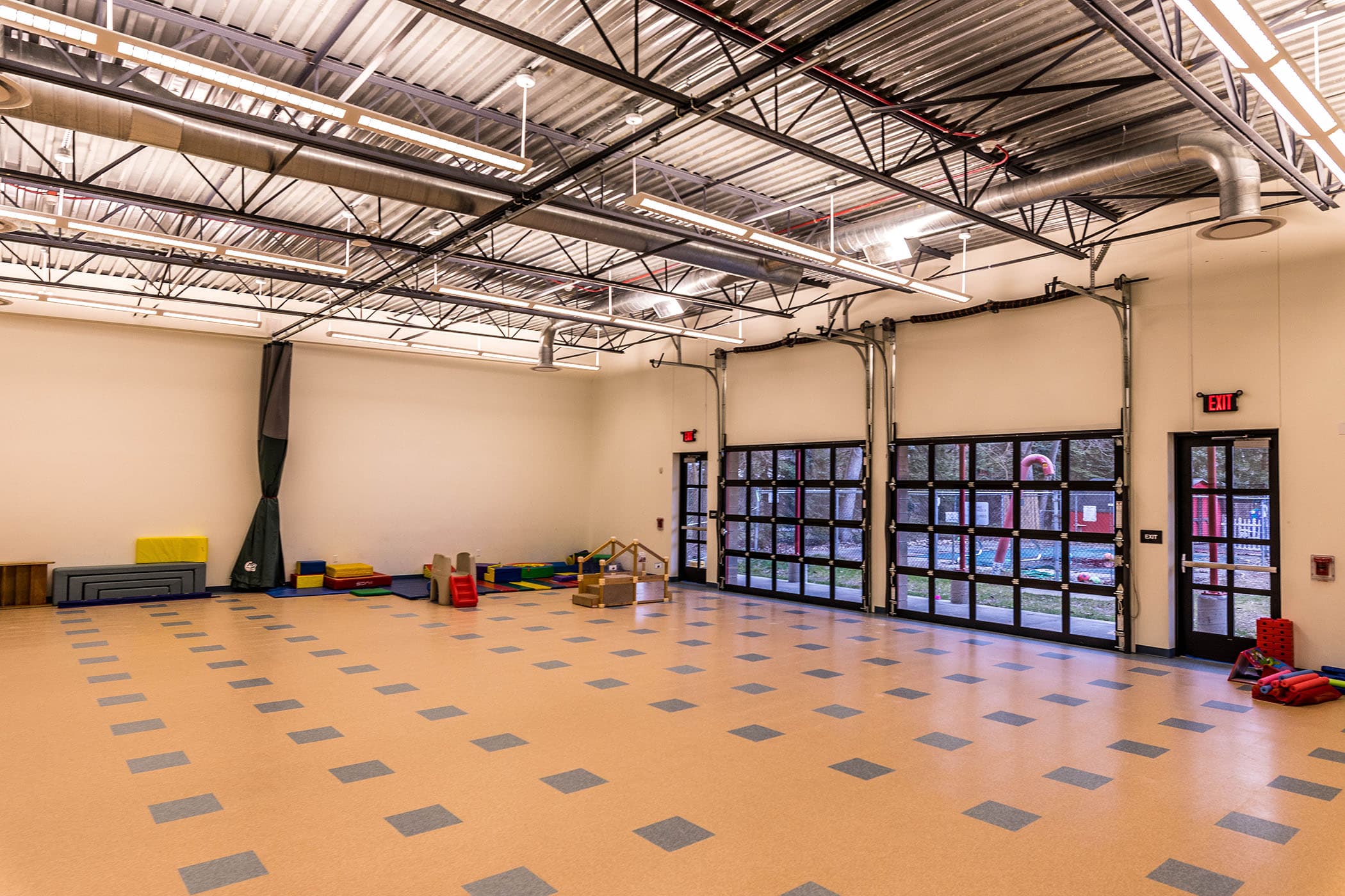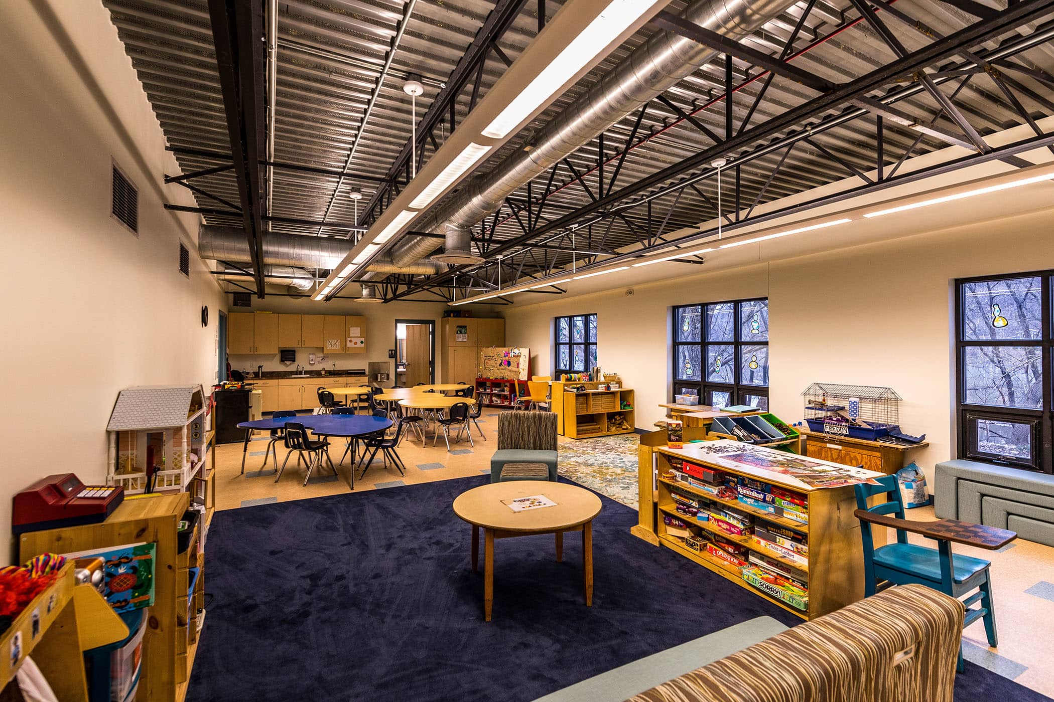 The RCC expansion and renovation included upgrades to the infant and toddler rooms, including water play and sensory areas; a new kitchen to accommodate lunch times for all students at the school; a new addition to the school along the back which incorporated a new gathering/play space with garage doors that open to the outdoor area, giving students and staff indoor/outdoor space when the weather is nice; additional classrooms and renovation to the front administrative offices and conference room.